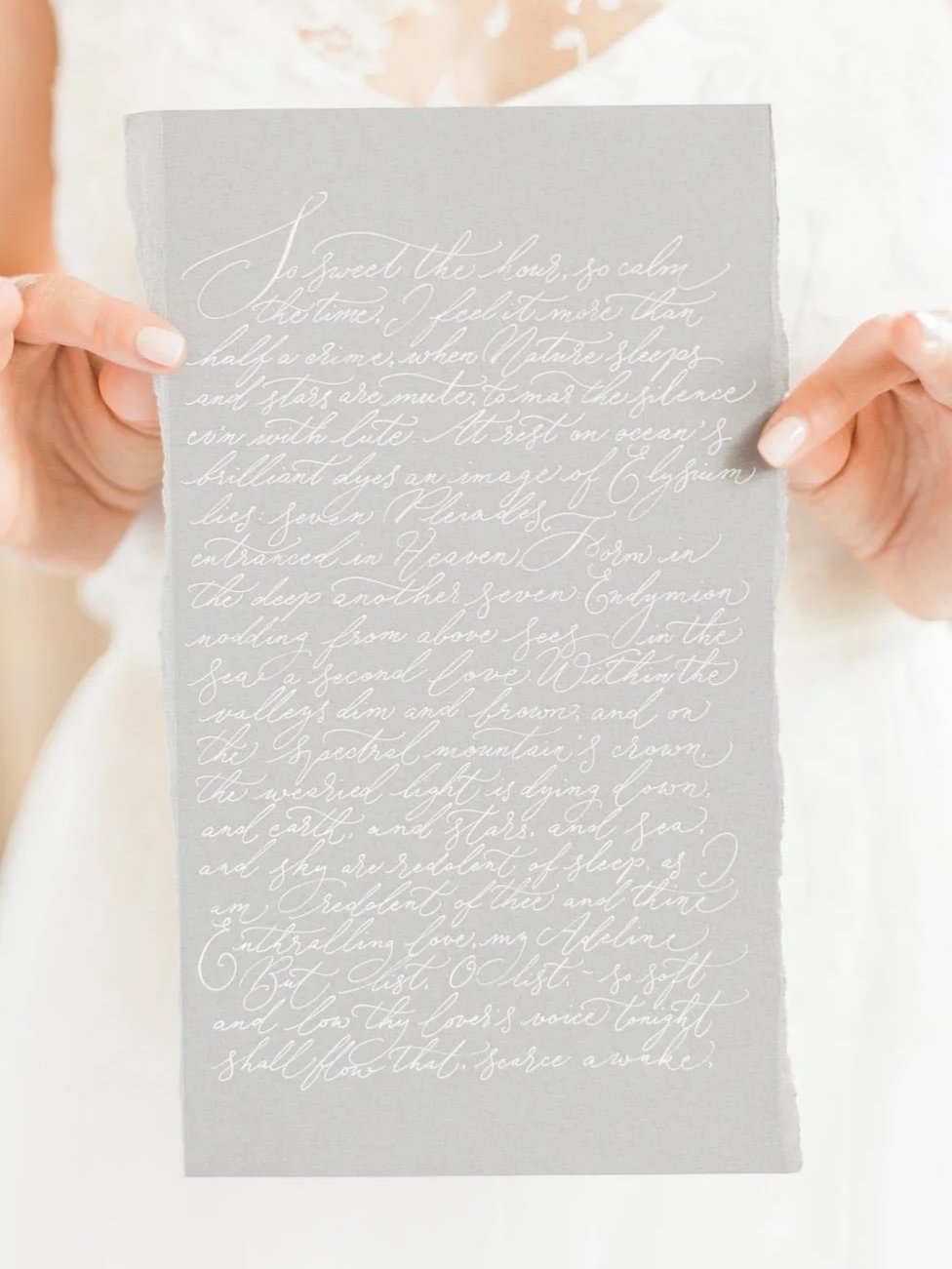 For wedding customers, I write beautiful calligraphy invitations, address envelopes in calligraphy, provide on-the-day stationery with a unique personal touch and transform your meaningful wedding readings into keepsake art pieces.